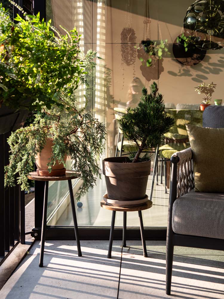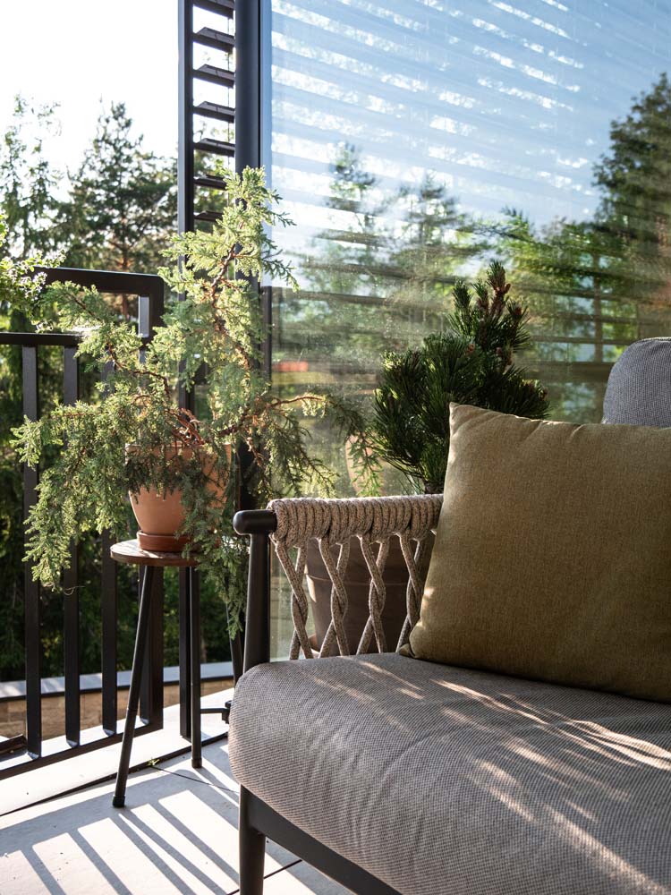 An einer Seite abgegrenzt durch ein Fassadenelement (Sichtschutz) und auf der anderen durch die Glasecke des Wohnraums entstand eine gemütlicher Rückzugsort im Freien. Die frei angeordneten Sitzmöbel bilden eine Erweiterung des angrenzenden Wohnraums, der durch die Grasfront unmittelbar mit der Balkonnische verbunden ist. Beistelltischchen, eine Truhe zum Verstauen von Gartenutensilien und jede Menge Pflanzen ergänzen die gepolsterten Sitzmöbel.
