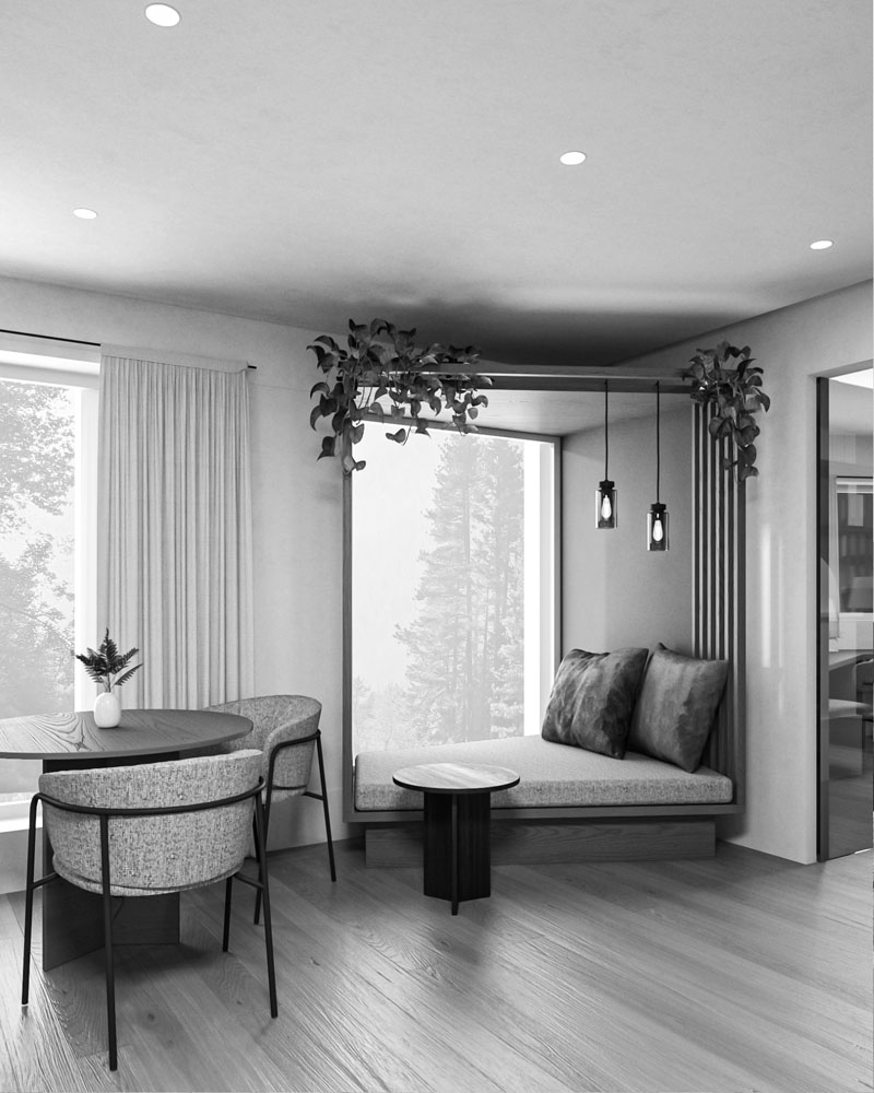 Im Rahmen der Neugestaltung wurde das gesamte Erdgeschoss des Berghaus Rosengarten in Welschnofen (BZ) umgebaut und erweitert. Vom zentral gelegenen Eingangsbereich gelangt man in die Lobby mit Rezeption und einladenden Sitznischen zum Verweilen. Der Speisesaal schließt direkt an der Bar an und wurde um einen weiteren Saal erweitert. Ein stimmiges Design wurde geschaffen, um die 2 Speisesäle zu vereinen. Ein zentraler Buffettisch bildet das Verbindungsglied zwischen altem und neuem Speisesaal. Die bestehende Außenwand wurde in das Design integriert. Vertikale Steher strukturieren den Raum und sorgen für Privacy. Dieselben Steher wiederholen sich in der Rezeption, der Lobby und der Bibliothek. Eine Auswahl an natürlichen Materialien und dezenten Farben verschmelzen, gemeinsam mit den minimalistischen Gestaltungselementen, zu einem zeitlosen Raumdesign.