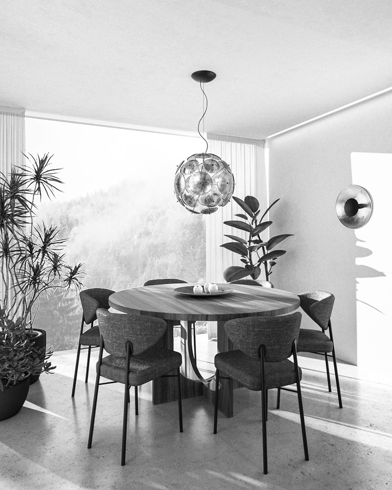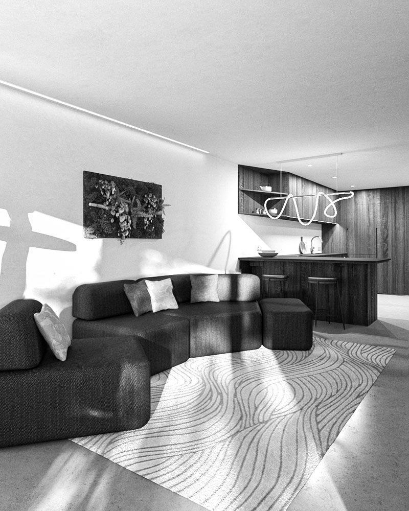 Der Einrichtungsstil kombiniert Minimalismus mit gezielt gesetzten Akzenten: Während klare Linien und reduzierte Formen für Ruhe und Struktur sorgen, ergänzen Art-Déco-Elemente sowie japanisch inspirierte Details die Gestaltung mit einer individuellen Handschrift. Jedes Objekt erfüllt eine Funktion und ist Teil eines Gesamtkonzepts.